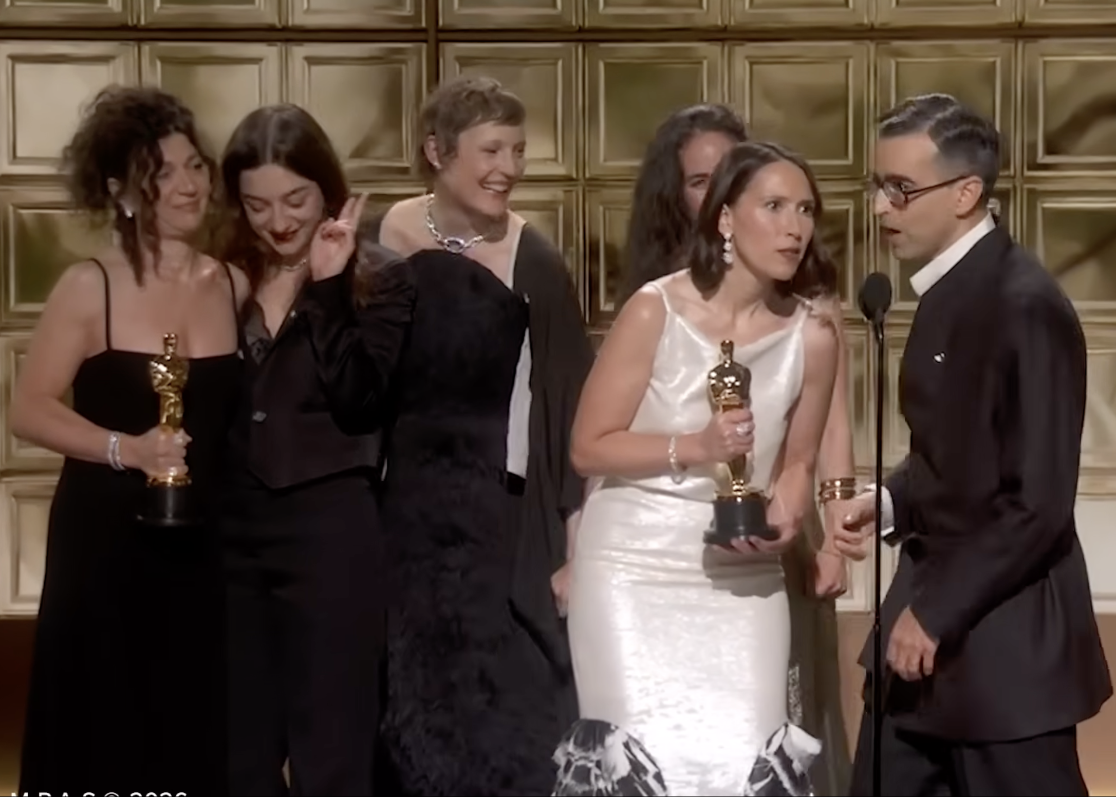 Në fotografi, Luàna Bajrami qëndron pak pas kolegëve të saj në skenë, e veshur me të zeza, duke buzëqeshur me një gëzim të qetë. Në momentin kur përmendet emri i saj, ajo ngre lehtë dorën dhe formon me gishtat shenjën “V” të fitores.